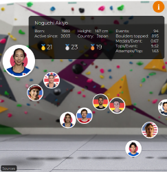 I’ll start this post with a little bit of background on why I made the visualisation in the first place. Now, I am really into climbing. Though I’m not particularly good at it, I do it quite a bit. I’m into it so much that I’ve been watching pretty much all the top-tier climbing competitions for the past few years. So, when I decided to find some data and do something fun with it in order to build up my data science portfolio after I quit being a uni teacher, climbing data were the obvious choice. I didn’t know what kind of data I would be able to get or what I would do once I have them but I was quite excited. The fun thing about projects like these is that you end up not only exercising your creative, design, and analytical skills but also learning something new about the subject matter. For example, I always knew that Akiyo Noguchi was pretty amazing, but playing with the app made me learn more about quite how amazing she was1. Finding Data There is no one right way of going about a project like this. You can, if you wish, start at the drawing board and design the end product and then figure out how to make it.